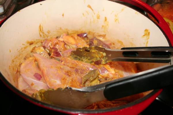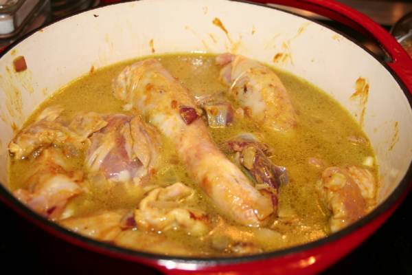 Faîtes revenir les oignons coupés dans un mélange beurre / huile, puis tous les morceaux de poulet. Couvrez avec le bouillon et laissez cuire doucement 1h30.
