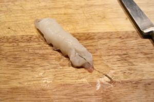Poser la chair « sur le ventre », pratiquer une petite incision en bas du dos, repérer le boyau, tirer dessus, ça vient tout seul. Cette opération est importante pour éviter une amertume désagréable que ce boyau risque de donner à votre plat, ce serait dommage.
