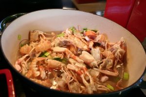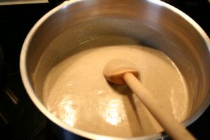 Quand c’est cuit, filtrer, jeter tous les morceaux. Récupérer la moitié du bouillon obtenu. Griller la demi-baguette et le croissant, et les incorporer dans le bouillon. Ecraser, ajouter 100 gr de beurre en morceaux, et 50 gr de crème fouettée. Passer au mixeur plongeant pour obtenir une sauce liée.