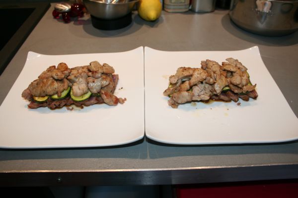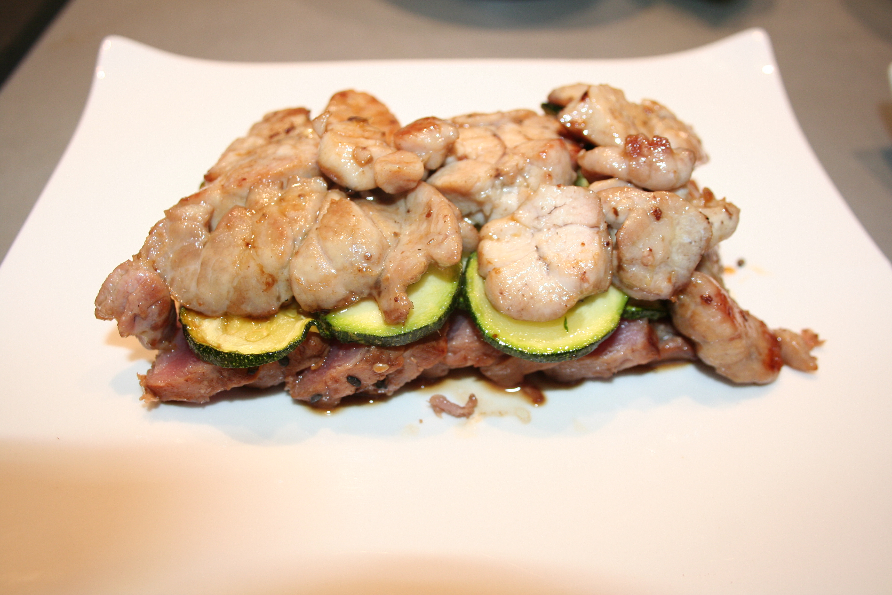 Rectifiez l’assaisonnement après avoir goûté (privilège de celui qui cuisine), puis disposez de fines tranches de thon dans l’assiette, recouvrer de tranches de courgettes bien disposées et terminez par les ris. Arrosez d’un peu de « marinade – sauce » qu’ il vous restait, et servez sans plus attendre. Bon appetit, petits veinards.