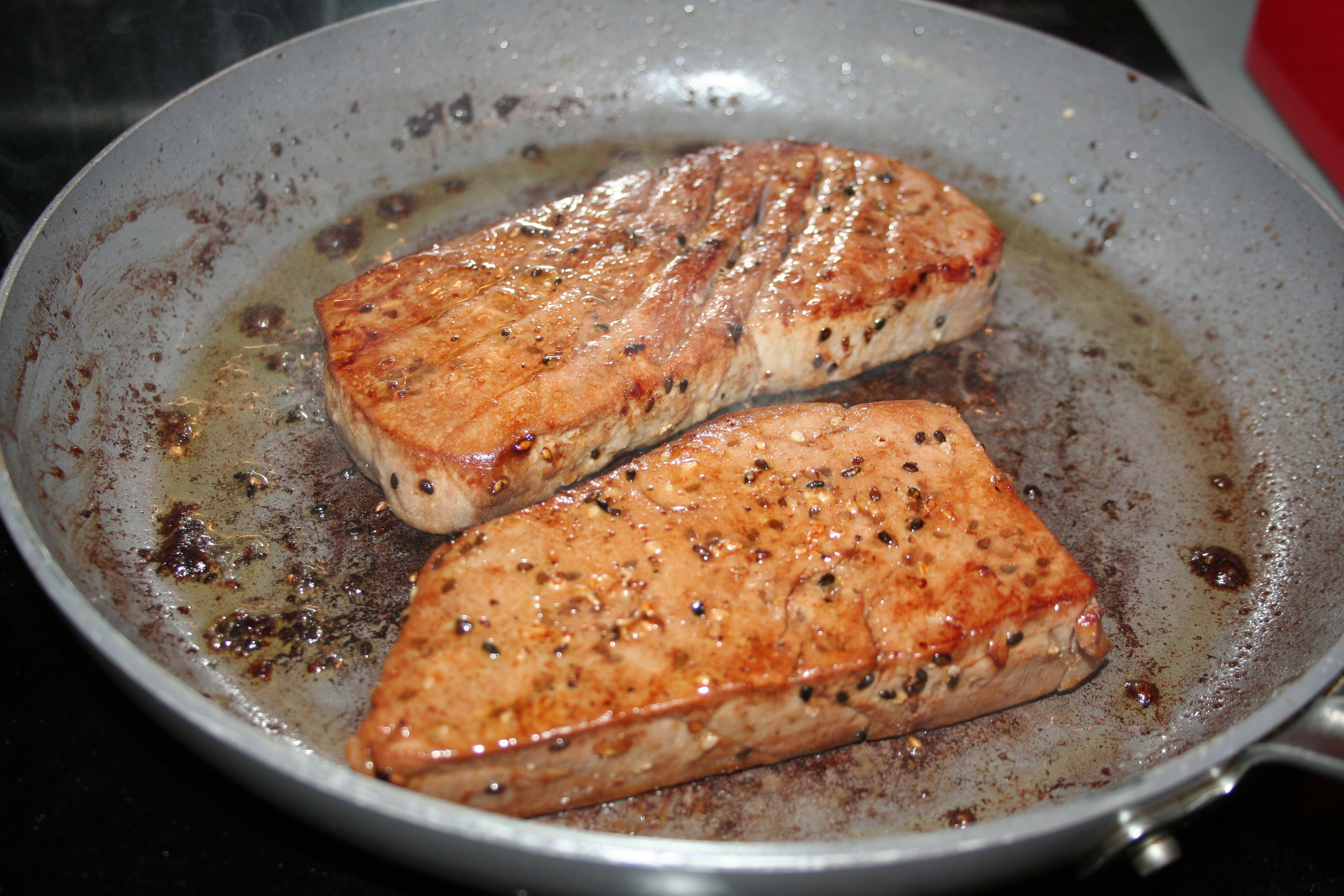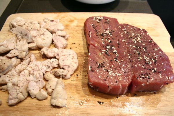 Dans deux poêles séparées, faîtes cuire d’une part, le thon, à feu vif, juste quelques minutes sur chaque face, le coeur doit rester rouge, c’est indispensable. Le ris, quant à lui, demande plus de douceur, il ne faut pas le saisir. Si vous voulez qu’il soit un peu doré, voire croustillant (je le préfère moelleux, mais ça n’engage que moi), il faut le cuire dans du beurre, pour la coloration. Lorsque le thon est cuit, coupez le en fines tranches.