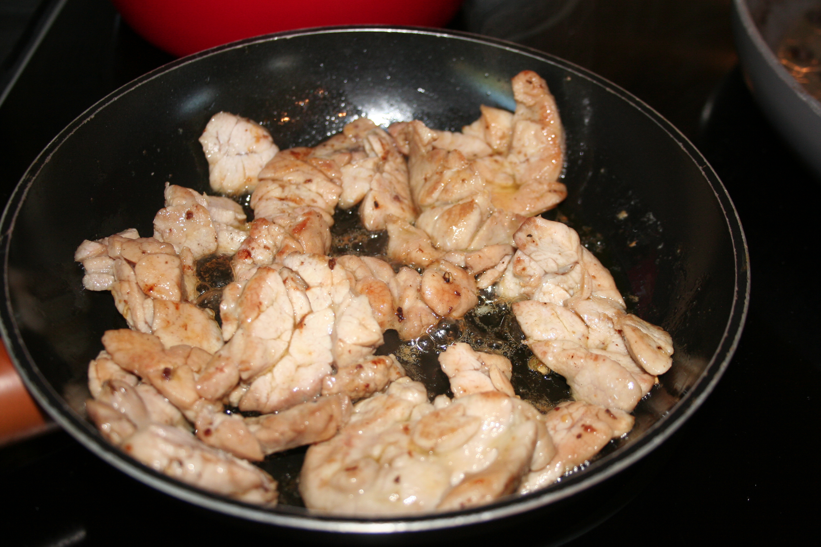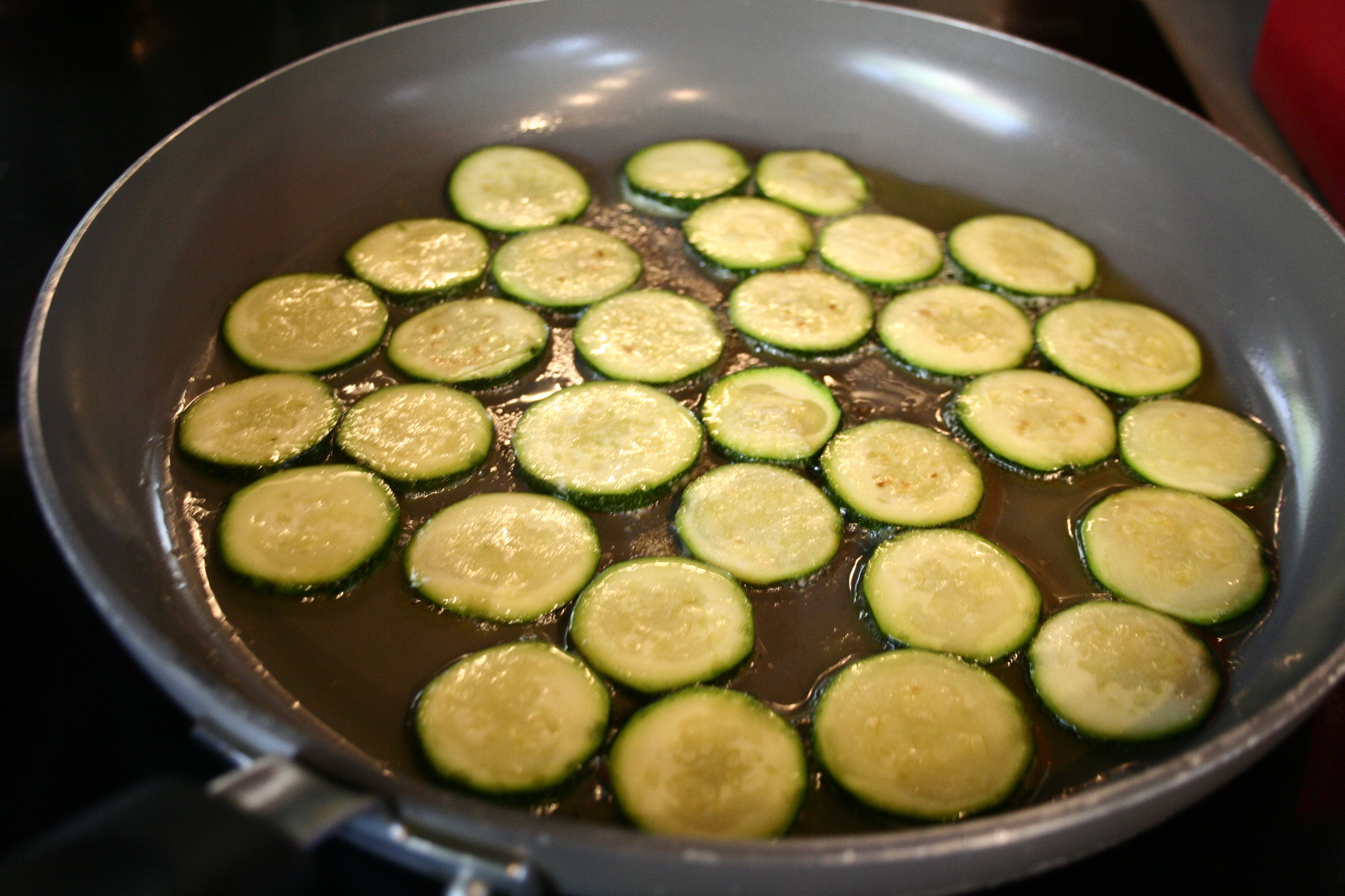 Coupez la courgette en tranches fines, et faîtes la cuire doucement dans un peu de matière grasse, à la poêle. Réservez.