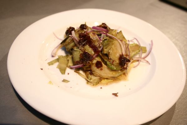 Présentez les artichauts en petit tas, parsemez de très fines tranches d’oignon rouge, arrosez de sauce. Servez tiède si vous voulez, ou à température, mais pas froid. Bon app’