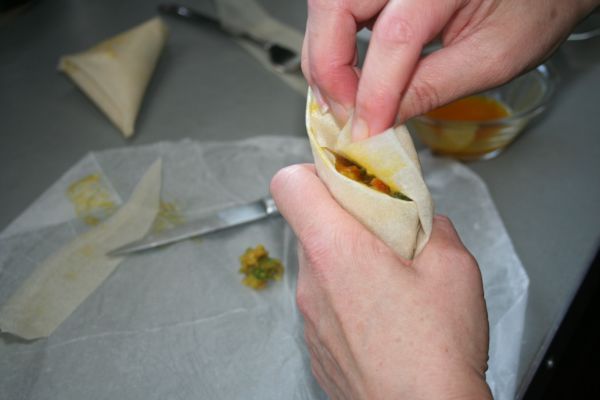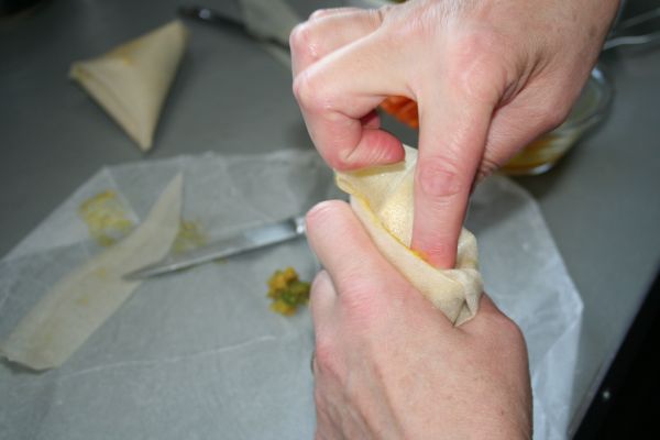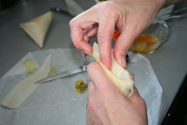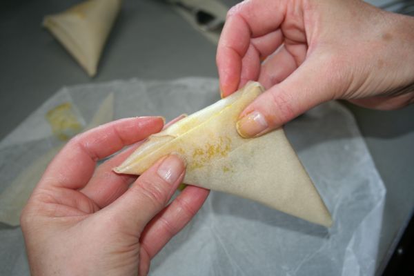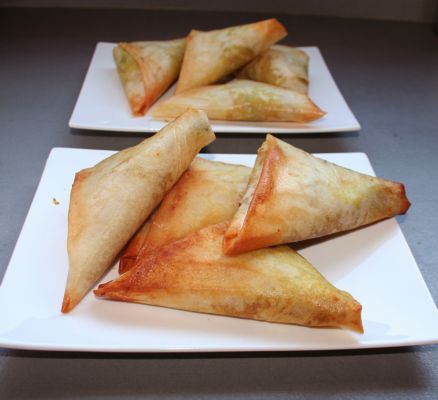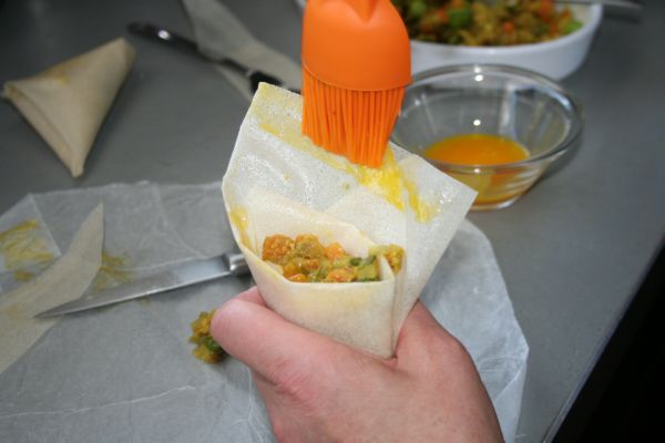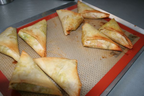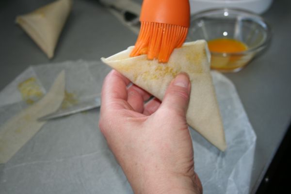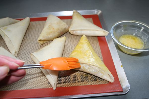Pour que la feuille de brick adhère bien, on peu utiliser de l’oeuf battu. Lorsque les samoussas sont tous terminés, il faut les badigeonner de beurre fondu (clarifié si possible), avant de les enfourner 15 /20 min. à 170°C.