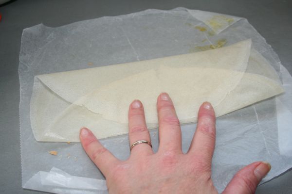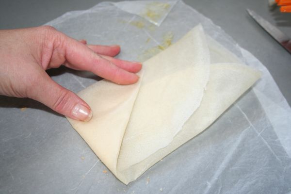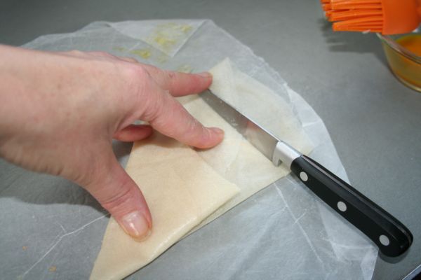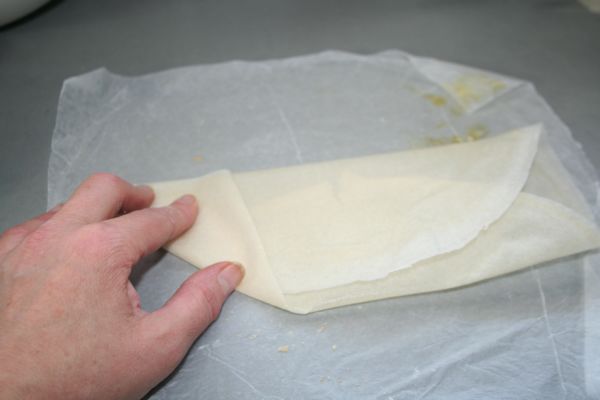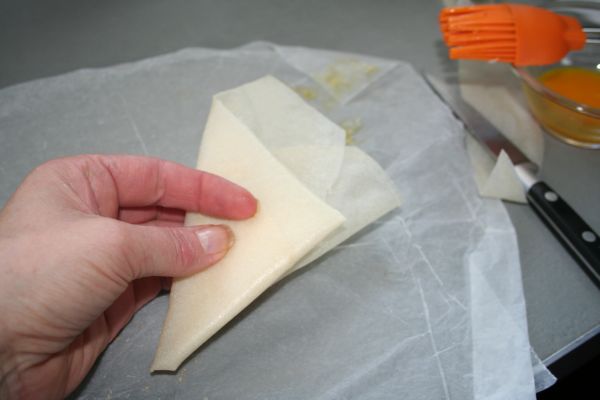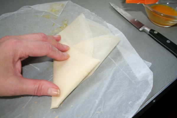 Laisser refroidi les farces avant de farcir les samoussas de la façon suivante : plier la feuille de brick en un long rectangle, puis en triangle, jusqu’à ce qu’il reste une partie rectangulaire au bout, suffisamment longue pour fermer le chausson à la fin, Si c’est trop long, refaire un pli en triangle ou couper un morceau de la feuille :