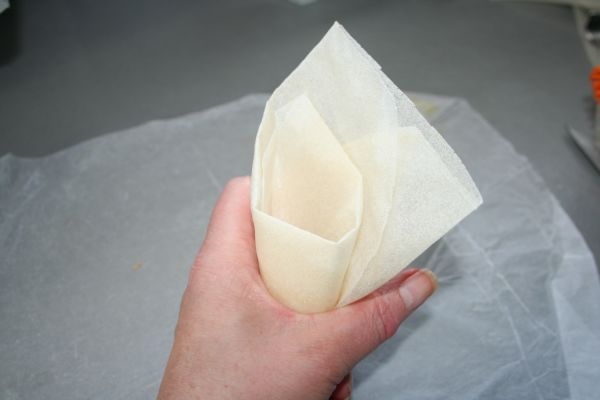 On obtient un pochon, il reste à le remplir de farce, puis à le fermer en repliant la partie qui dépasse :
