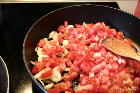 Faire revenir les tomates épluchées et coupées en petits morceaux, avec l’ail et l’oignon coupés, eux aussi, en petits morceaux. Vous pouvez, si le coeur vous en dit, ajouter quelques morceaux de poivron rouge.