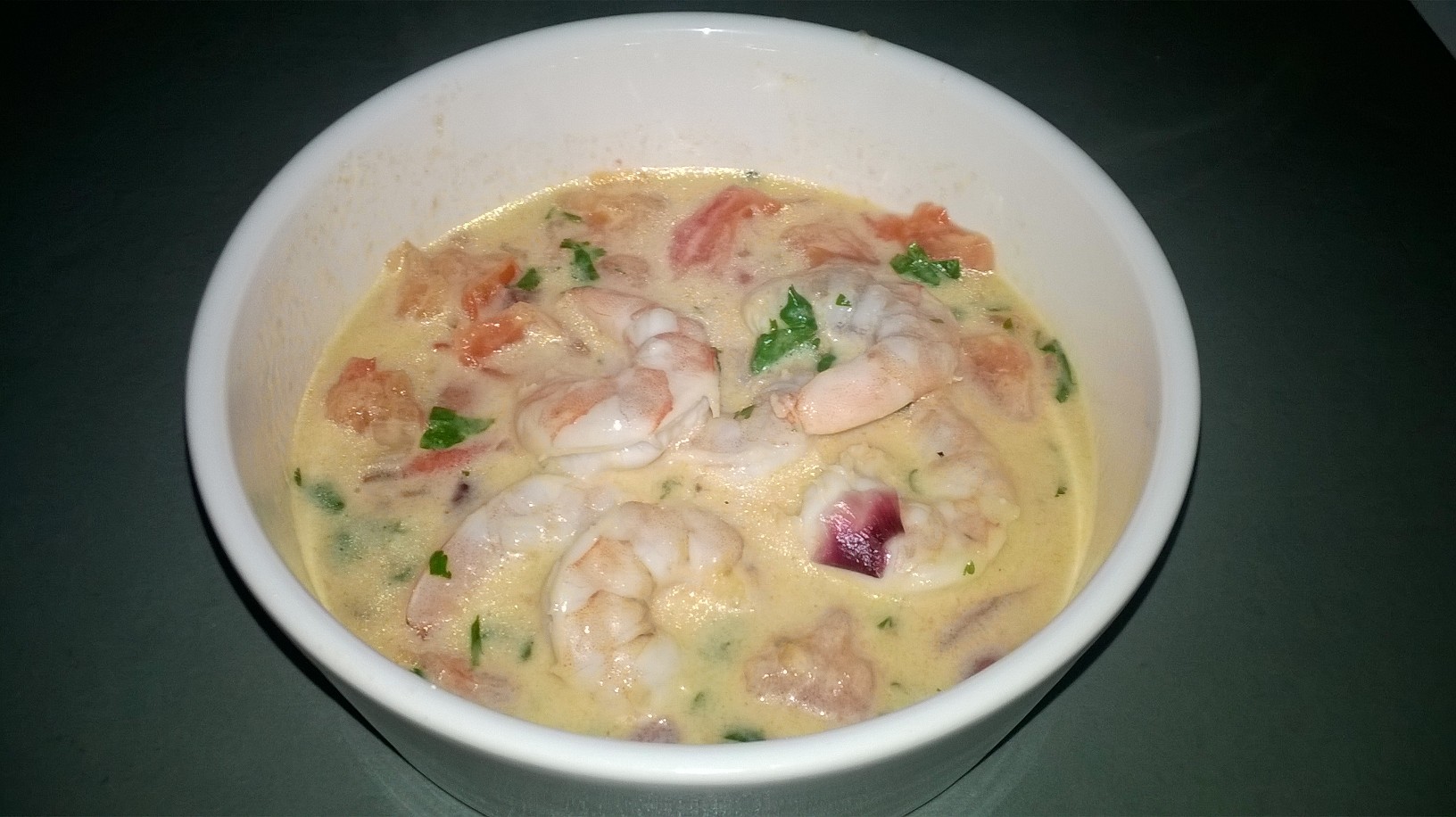 Laisser cuire doucement 1/4 d’heure. Ajouter la coriandre et le persil hachés, les clous de girofle moulus et l’ail écrasé. Laisser cuire encore 5 min, puis ajouter les crevettes marinées et le lait de coco.